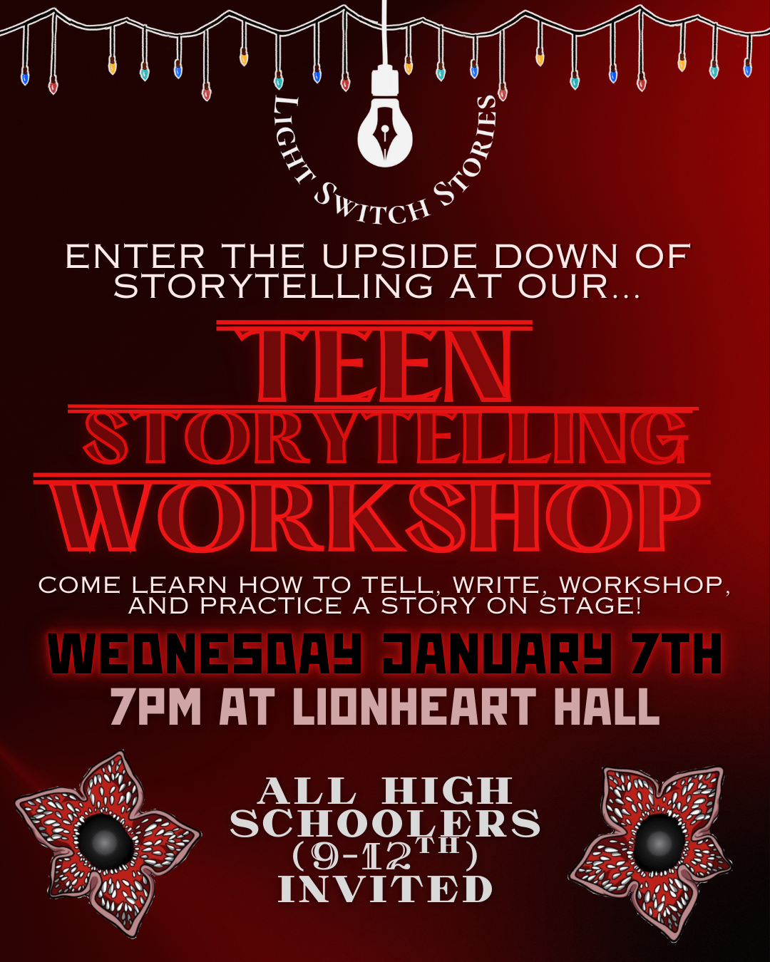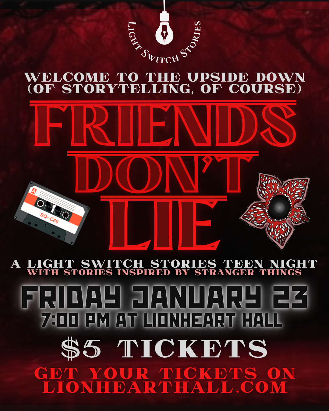 This January, LightSwitch Stories invites teens to step into a Stranger Things–inspired night of live storytelling centered on friendship, honesty, and growing up. Inspired by the iconic phrase “friends don’t lie,” this event explores the moments when truth matters most (whether it’s standing up for a friend, navigating change, or learning who you really are!)